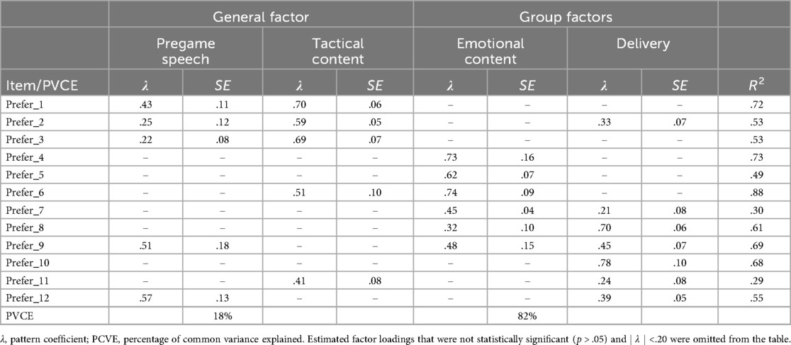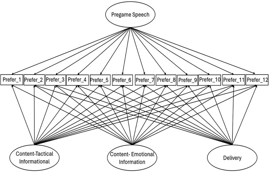 Methods: Participants were athletes (N = 264) at level-1 nested within NCAA varsity level teams (G = 36) at level-2. Participant survey responses were analyzed using an exploratory bifactor analysis with a general factor (i.e., pregame speech) and three grouping factors (i.e., tactical content, emotional content, delivery).