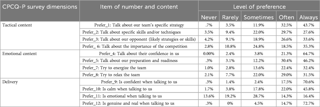 There are three specific factors proposed and defined in the CPCQ-P. Tactical Content (items 1–3, and 6), is understood as the verbal description of specific skills or strategies relevant to the competition. This four-item subscale asked athletes to consider their coaches’ descriptions of team specific strategy, specific skills or techniques, the opponent's likely skills or strategies, and the importance of the competition. Emotional Content (items 4–5 and 7–8) is considered the specific feelings or motivations verbally discussed by a coach in their pregame speech. The four items of the CPCQ-P that measure Emotional Content items included athletes’ preference of their coach talking about their confidence in the team, the team's preparation, and using words to energize or relax the team. Lastly, Delivery (items 9–12) is the nonverbal messaging that accompanies the verbal content shared by the coach. These items included coaches’ display of confidence, calmness, emotion, and authenticity during their pregame speech.