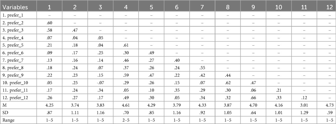 The last grouping factor, Delivery, was comprised of 4 items (Prefer_9–12). The standardized factor loadings from this group factor on the targeted items to measure Delivery ranged from .24 to .78. There were an three additional items that had meaningful cross-loadings on to this grouping variable (items 2, 7, and 8) that ranged from .21 to .70.