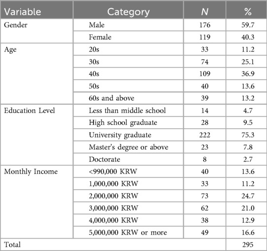 The questionnaire design prioritized both data quality and participant experience. It began with carefully constructed screening questions to verify participant eligibility, including confirmation of at least 5 years of residence, primary residence status in the study area, and age verification of 18 years or older. The average completion time ranged from 15 to 20 min, a duration that balanced comprehensive data collection needs with respect for participants' time. To maintain response authenticity and minimize participation solely for rewards, no direct monetary incentives were provided. Instead, participants were offered non-monetary benefits including access to a summary report of research findings upon study completion and entry into a raffle for local marine sports activity vouchers. Ten vouchers worth 50,000 KRW each were offered as raffle prizes, with this incentive disclosed only at the survey's conclusion to prevent reward-motivated participation that might compromise response quality. Table 1 presents the detailed demographic characteristics of the study participants, providing a comprehensive overview of the sample composition.