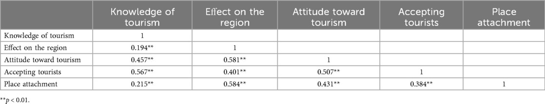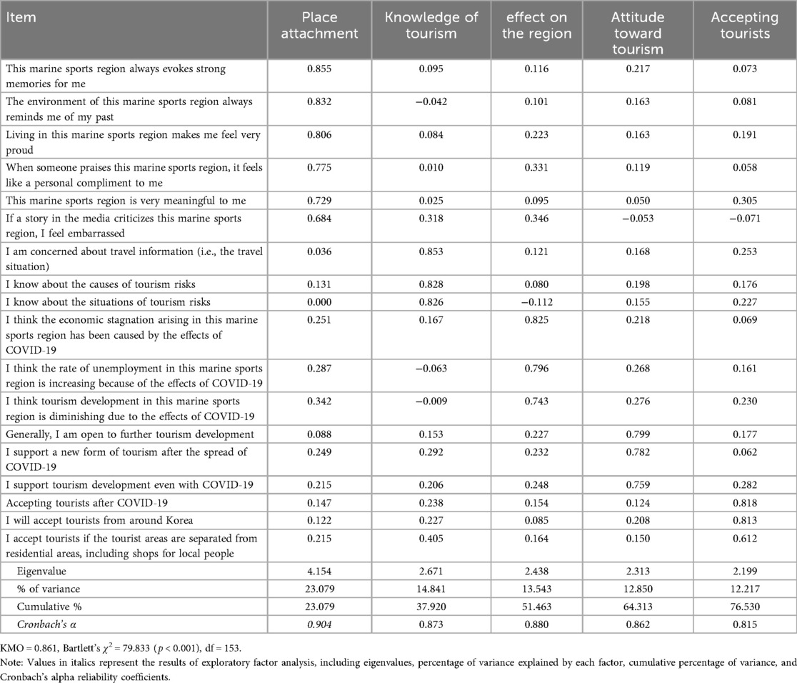 To verify the validity of each variable, we conducted an exploratory factor analysis was conducted. The exploratory factor analysis of the constructs—knowledge of tourism, effect on the region, attitude toward tourism, accepting tourists, and place attachment—resulted in the extraction of five distinct concepts. The Kaiser–Meyer–Olkin (KMO) measure of sampling adequacy value was 0.861, meeting the recommended threshold. The cumulative variance explained by the five factors was 76.530% (Table 2).