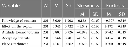 Tourism attitudes were assessed using three items adapted from Peters et al. (88), measuring residents' overall evaluative judgments toward tourism development. These items captured general openness to further tourism development, support for new forms of post-COVID tourism, and willingness to support tourism development despite pandemic challenges. Tourism acceptance, conceptualized as behavioral willingness rather than mere attitudinal support, was measured through three items adapted from Ashraf et al. (55). These items specifically addressed willingness to accept tourists after COVID-19, acceptance of domestic tourists, and conditional acceptance based on spatial separation between tourist and residential areas.