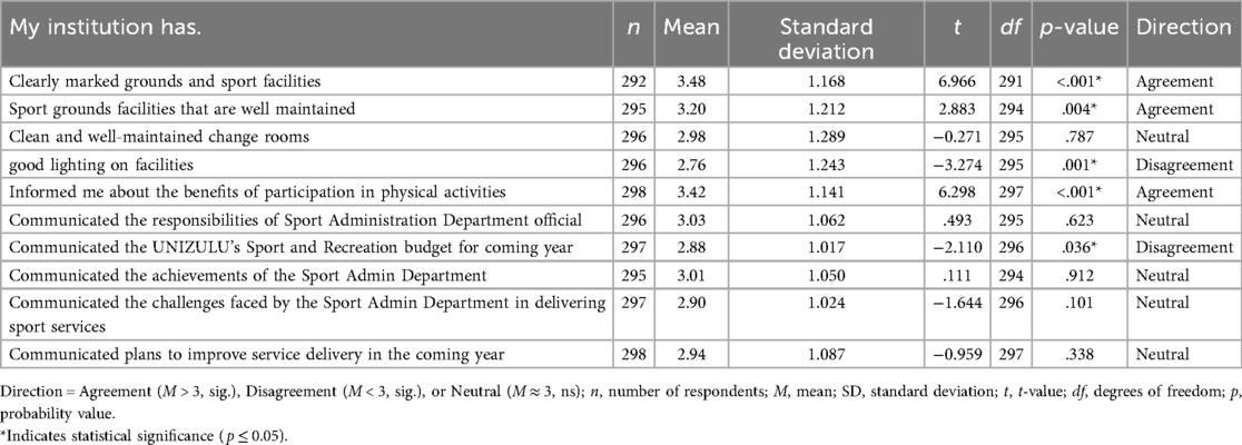 Exploratory Factor Analysis (EFA) revealed two dominant constructs: The Communication factor (Cronbach's alpha = 0.895) which explained 47.5% of the variance and included items related to achievements, challenges, budgets, and service plans. In turn, the Facilities factor (Cronbach's alpha = 0.771) which explained 11.9% of the variance and encompassed perceptions of facility maintenance, signage, and cleanliness. A subsequent one-sample t-test showed a significantly positive mean score for Facilities (M = 3.23, p < 0.001), suggesting general satisfaction with infrastructure. In contrast, the Communication factor score (M = 3.03, p = 0.572) was not statistically different from neutral, indicating inconsistent or insufficient communication from the Sport Administration Department. Complete tables including item factor loadings (Supplementary Table S1), variance (Supplementary Table S2), and one-sample t-test results for each factor (Supplementary Table S3) are provided in the Supplementary Materials.