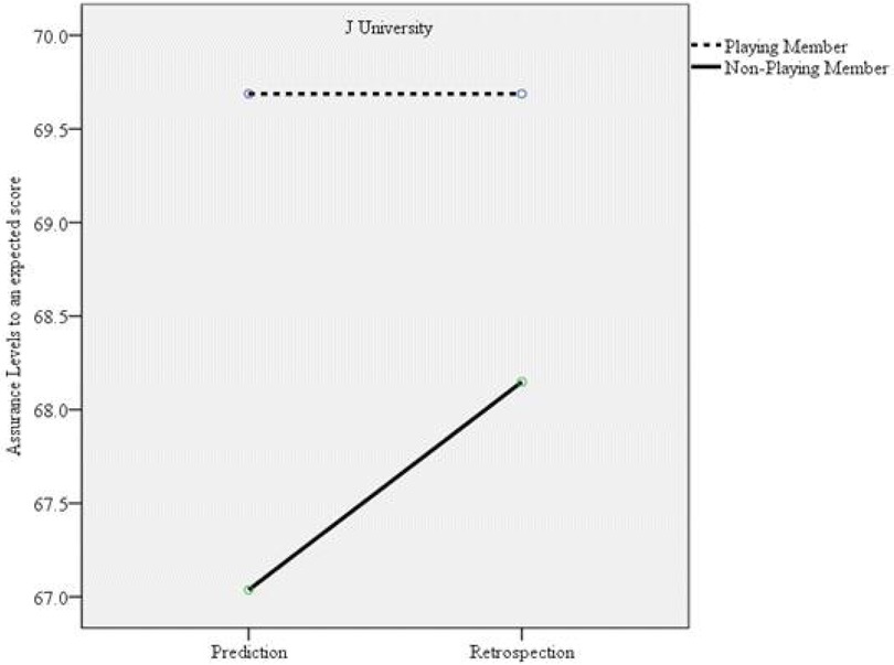 Figure 2. Interaction effect between the confidence levels for the expected match score between J university (winning team) playing members and nonplaying members.