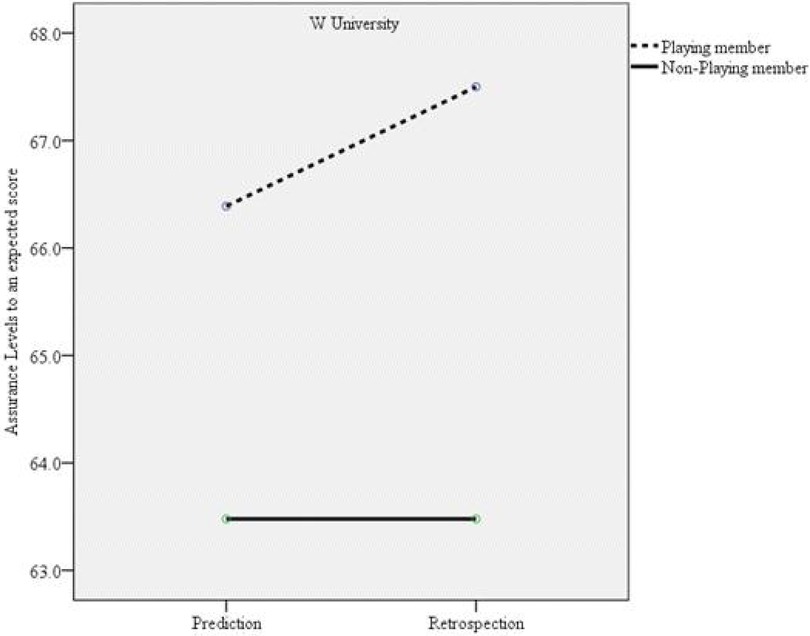 Figure 3. Interaction effect between the confidence levels for the expected match score between W university (losing team) playing members and nonplaying members.