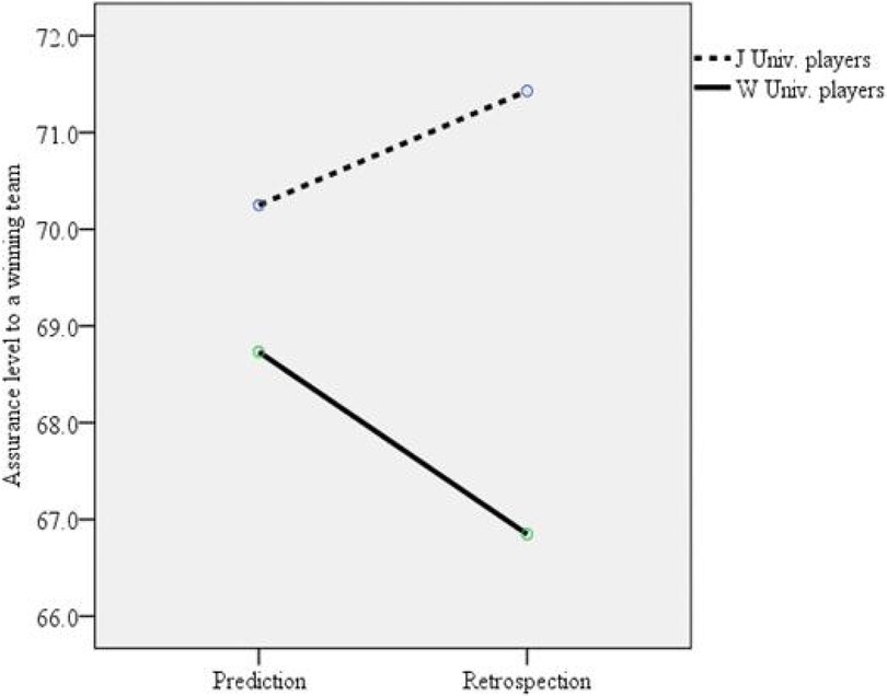 Figure 4. Interaction effect between the confidence levels for the expected winning team between J university (winning team) players and W university (losing team) players.