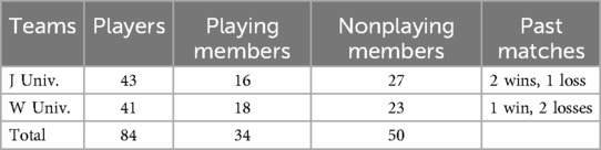 Male Korean soccer athletes (mean age of 21.7) from Jeonju (J) University (n = 43) and Woosuk (W) University (n = 41) participated in this study. Among the 84 participants, 16 of 41 players from J University and 18 of 41 players from W University were playing members. Historically, these two teams are competitive with each other, and J University has two wins and one loss against W University. Tabachnick and Fidell (33) suggested that for repeated measures ANOVA, the minimum sample size for each group is 10 plus the number of dependent variables. Based on this, the number of participants (n 16) available for each group in this study satisfied the minimum sample size requirement. Tables 1, 2 shows participants' characteristics. The research protocol was approved by the Ethics Committee of Zhengzhou University (ZDLL—20250377) and adhered to the ethical standards outlined in the 1964 Declaration of Helsinki and its later amendments. All participants signed an informed consent form.