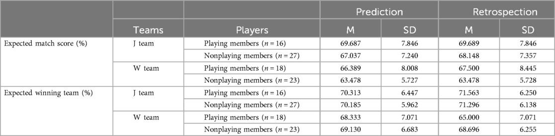 Table 3. The means and standard deviations of the confidence ratings for the expected winning team are presented.