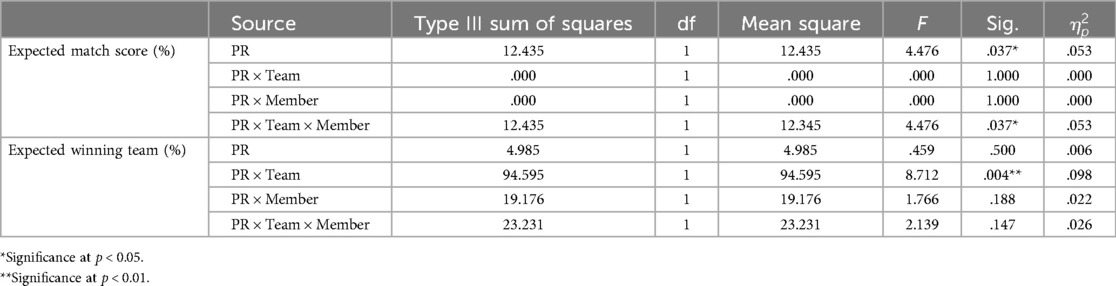 Levene's tests for the repeated-measures variables for confidence ratings for the expected winning team for foresight, F(3, 80) = .70, p = .56, and hindsight, F(3, 80) = .74, p = .53, were nonsignificant. These tests showed that the variances were homogeneous for all levels of the repeated-measures variables and indicated that the F-tests for repeated-measures variables are reliable (38). This study had two within-subjects conditions (time factor: foresight and hindsight). Thus, Mauchly's test to examine violations of sphericity was not conducted because at least three conditions are necessary for sphericity to be a concern. The main effect of the confidence ratings for the expected winning team between foresight and hindsight was nonsignificant, F(1, 80) = .46, p = .50, = .006. This finding indicated that when team and player factors were ignored and only the time factor was considered, there was no identified hindsight bias in participants' confidence levels for the expected winning team.