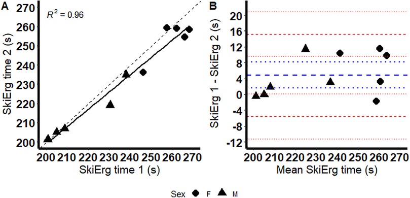 Figure 2. Correlation (sold line) plot for completion time between the first and second test from the concept 2 SkiErg™ (A); dashed line represents the line of identity. Bland–Altman plot showing the mean difference (thick blue dashed line), 95% confidence interval (95% CI) for the mean difference (dotted blue line) and the 95% limits of agreement (thick dashed red lines) and their 95% CIs (dotted red lines) of the first and second test from the Concept 2 SkiErg™ (B).