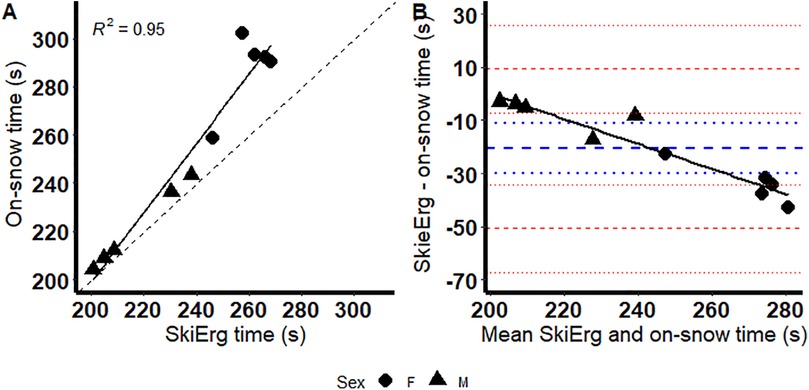 Figure 3. Correlation (solid line) plots between the SkiErg™ and the on-snow test for completion time (A); dashed line represents the line of identity. Bland–Altman plot showing the mean difference (thick blue dashed line), 95% CI for the mean difference (dotted blue line) and the 95% limits of agreement (thick dashed red lines) and their 95% CIs (dotted red lines) between the SkiErg™ and the on-snow test (B); solid black line represents linear regression of the differences on the mean.