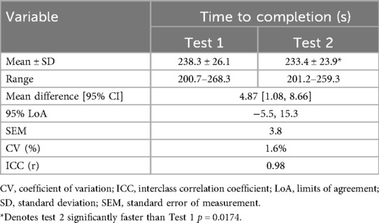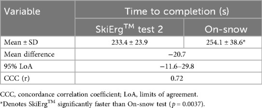 Results: There was a significant decrease in time from test 1 to test 2 of 4.87 s [238.3 ± 26.1 vs. 233.4 ± 23.9 s; 95% limits of agreement (LoA): −5.5, 15.3]. The Concept 2 SkiErg™ time-trial had a coefficient of variation (CV) of 1.6% and the standard error of measurement was 3.8 s. When compared to the on-snow time-trial, the Concept 2 SkiErg™ time-trial demonstrated a mean bias of 20.7 s (95% LoA; 11.6, 29.8) and the concordance correlation coefficient was 0.72.