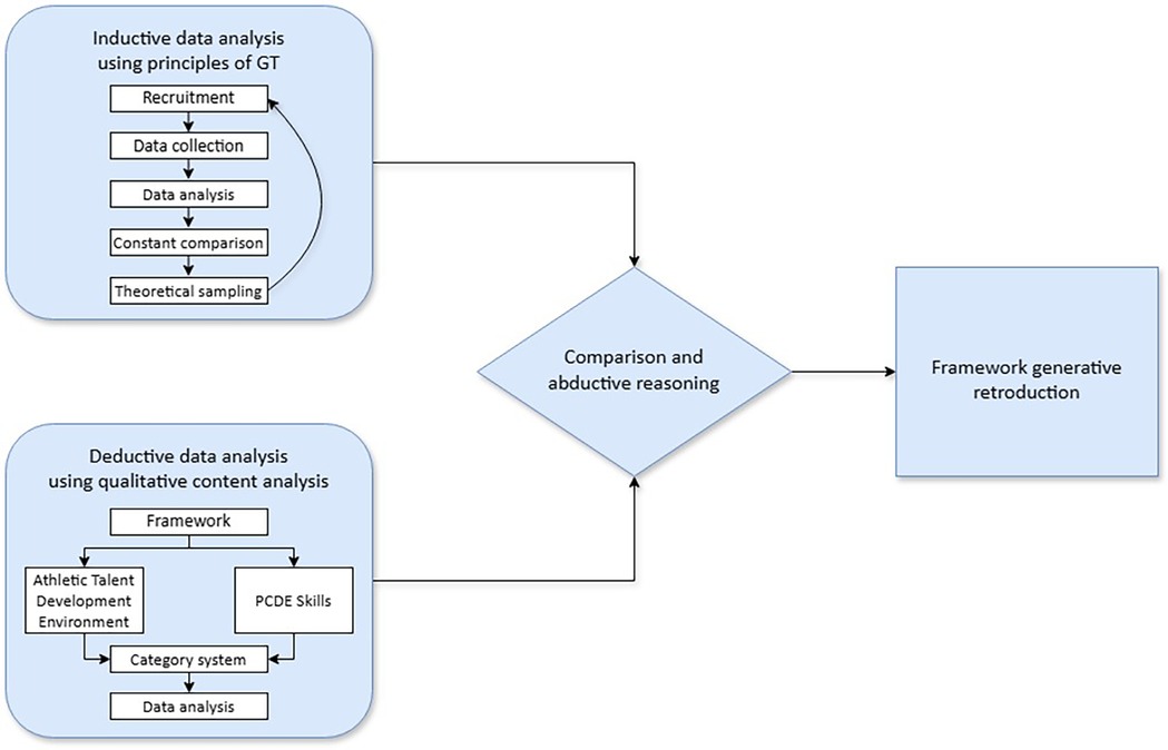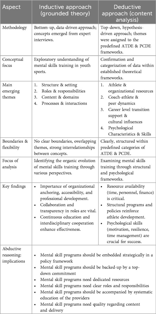 Given the existence of established theories in the field of talent development, in the second research stage data were analyzed deductively via qualitative content analysis (42). The participants' responses were categorized into predefined themes on the basis of two frameworks: the Athletic Talent Development Environment (ATDE) (7) and the Psychological Characteristics of Developing Excellence (PCDE) (1). In the final research stage, abductive reasoning was carried out by comparing the inductive and deductive results.