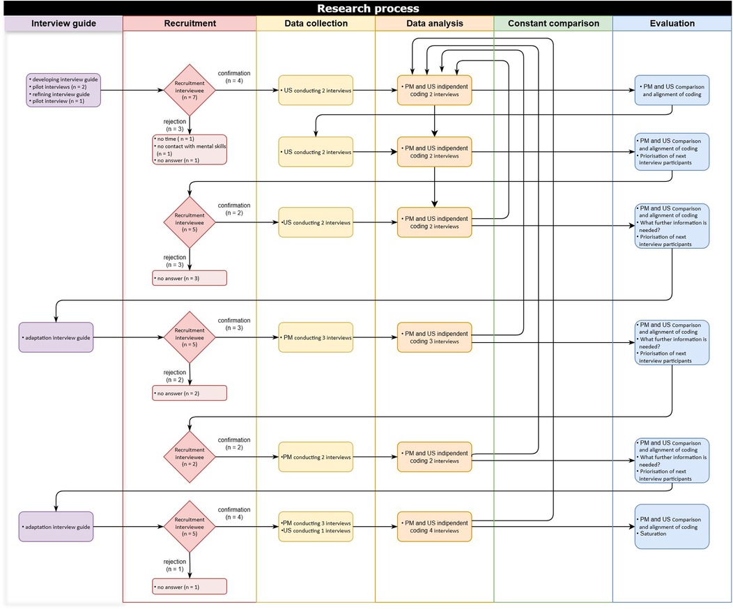 Based on the concepts of iterative data collection and theoretical sampling, the guideline was adapted after each round of data collection and analysis during the evaluation phase. For example, during the first round of further development, direct questions about gender differences and responsibility for mental skills training were added. The second iteration included specific questions about the necessary steps for successfully implementing mental skills programs.