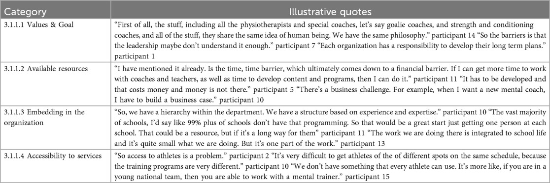 With respect to athlete resources, three clusters emerged in the stakeholder interviews: “time resources”, “personal resources” and ‘financial resources. The stakeholders particularly emphasized that a lack of time was a major challenge in the implementation of mental skills development programs, as balancing training and education schedules can often be an obstacle. Personal resources were also mentioned as a potential implementation barrier, with the greatest challenge being the availability of mental coaches/sport psychologists in relation to the number of athletes. In addition, financial resources were described as playing a crucial role in implementing mental skills development programs, as insufficient funding limited access to mental training and its providers. Taken together, these findings highlight the importance of available resources for an athlete's long-term mental skill development.
