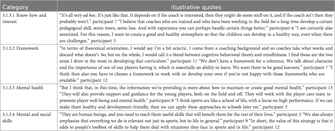 With respect to the conceptualization and content of mental training programs, know-how and interest, framework, mental health, and mental and social skills were key categories mentioned by the stakeholders. Table 3 contains representative quotes to illustrate the categories related to the third concept, “content & domains”.