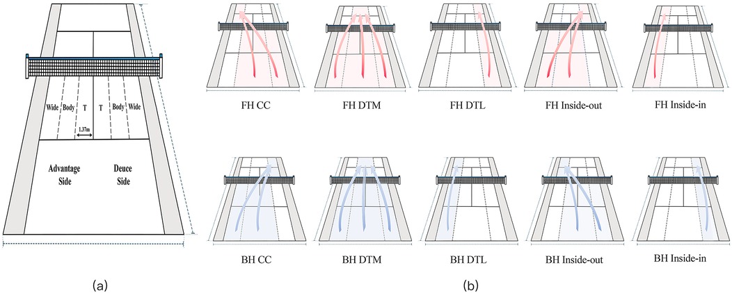 Figure 1. Illustration of serve and stroke directions. (a) The illustration of the service side (Advantage and Deuce) and service placement (Wide, Body and T); (b) groundstroke direction distribution; CC: crosscourt; DTM: down the middle; DTL: down the line.