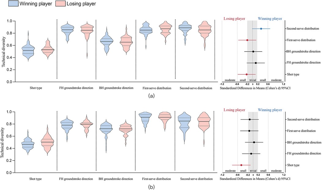 In summary, the study revealed diversity in technical-tactical performance among elite tennis players during matches. All the five technical-tactical performance variables had no statistically significant difference in match outcome. Maybe diversity of technical-tactical performance was not an indicator to assess match outcome. It might be more suitable for describing player style. The higher diversity of shot type in males compared to females suggests that it is important for coaches to be aware that any expectations and goals set are realistic and sex specific. The higher diversity of forehand groundstroke direction and lower diversity of forehand groundstroke direction in males compared to females suggests that male players should focus on improving the attacking ability of their backhand if they want to enter the top ranks. The lower diversity of first-serve distribution in females compared to males suggests that female players with excellent ability of serve should consider more about stability of first serve in serve game. Future research will focus on a point-by-point analysis of technical-tactical diversity by using ball and player tracking data, integrating factors such as speed, spin, and depth.