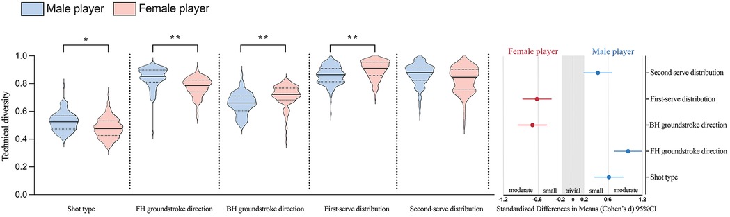 Figuress 2,3 show the diversity of technique-tactical performance indicated among elite tennis players related to match outcome and gender, and standardized (Cohen's d) differences in five technical-tactical performance variables. Winning and losing players showed no statistically significant difference (p>0.05) among five technical-tactical performance variables (the ESs were unclearly trivial to possibly small). The diversity of shot type (p = 0.03, ES = 0.63, small to moderate) and forehand groundstroke direction (p < 0.01, ES = 0.97, moderate) for male players are higher than for female counterparts. The diversity of backhand groundstroke direction (p < 0.01, ES = −0.70, small to moderate) and first-serve distribution (p < 0.01, ES = −0.62, small to moderate) for female players are higher than for male counterparts. The diversity of second-serve distribution (p = 0.07, ES = 0.44, small) shows no statistically significant difference between males and females. Finally, a follow-up comparison shows that Top-10 male players have an even higher degree of diversity in forehand groundstroke direction (male: 0.87 ± 0.06, female: 0.77 ± 0.06, p < 0.01, ES = 1.43, large), while lower diversity in backhand groundstroke direction than Top-10 female players (male: 0.67 ± 0.08, female:0.72 ± 0.06, p = 0.02, ES = −0.77, moderate).