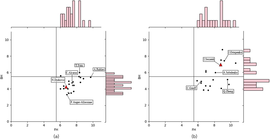 Figure 4. Forehand/backhand groundstroke winners and forcing shots for male and female players at the 2023–2024 Australian open. (a) represents male players and (b) represents female players.