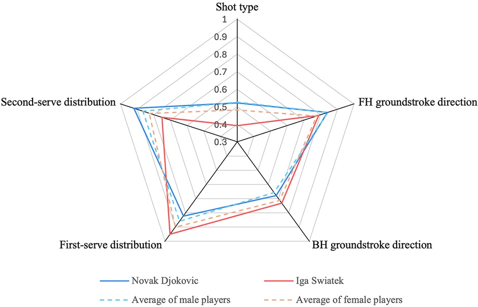 Figure 5 presents the mean of the standard entropy of technical-tactical performance indicators for the top 10 ranked male and female players and the rest. Both Novak Djokovic and Iga Swiatek distinctively showed no statistically significant difference from their peer players in all indicators (p > 0.05), but both players exhibited different diversity levels at their serve distribution.