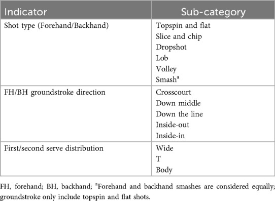 An initial inclusion of technical-tactical aspects relevant to player diversity was conducted by consulting two professional tennis coaches at the ATP tour-level and a performance director of national tennis teams. After that, a review of the extant literature was completed to help determine the indicators (31). Finally, five technical-tactical performance indicators were extracted from player's match actions and events (see Table 1). Smashes are not frequently used in matches, especially the backhand smash. Therefore, the smash-in-shot type is no longer categorized into forehand and backhand.