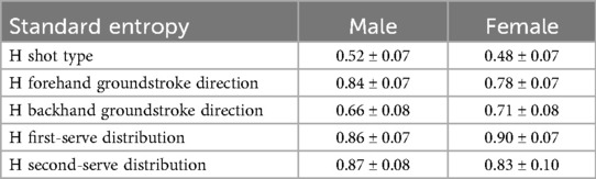 Entropy, a concept originating from thermodynamics and later adopted in information theory, is used to quantify the disorder and uncertainty of a system (22, 23). A higher entropy value indicates greater uncertainty. Performance variability and uncertainty can be quantified by using entropy, which provides a way to assess the overall state of the system. Entropy has been applied as an indicator of complexity in various sports (24, 25). For instance, Moras et al. (26) have used non-linear measures of entropy to analyze movement variability in resistance training among elite rugby players. Silva et al. elaborated on the use of various entropy measures to examine performance variability in team sports, revealing the interactions that shape players’ and teams’ performances (27). In soccer, Martinez et al. employed spatial and temporal entropy to analyze the randomness in football passing networks, identifying varied entropy levels across teams (28). In badminton, Galeano et al. used standard and spatial entropy to analyze the strike position distribution (29). However, the application of entropy methodologies remains underexplored when considering qualitative and categorical variables, where the distribution of each behavior can unveil the degree of disorder for a player or a team performance (24). Tennis, being a complex sport, cannot be fully understood through single-dimensional or static statistical indicators, thus calling for more aggregated analysis using standard entropy.