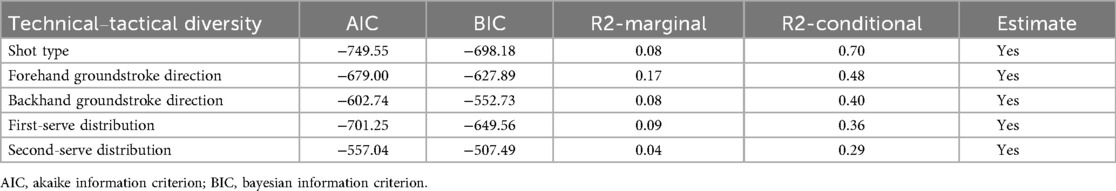The JAMOVI statistical package (version 2.4.11) was utilized to perform linear mixed model (LMM) to discern the difference of match outcome (win, loss) and gender (male, female) on technical-tactical diversity. LMM was apt for our design due to its proficiency in managing repeated measurements and encapsulating both fixed and random effects (ID for each player: repeated measure), enabling a nuanced analysis of intra- and inter-player variability.