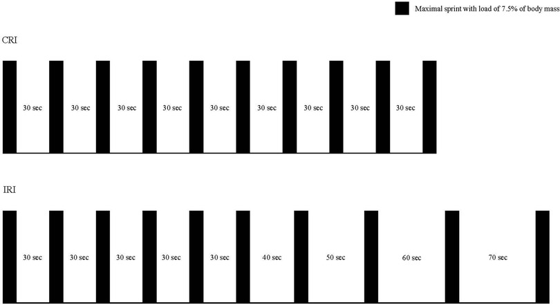 Figure 1. Repeated sprint training protocols of CRI and IRI. CRI, constant rest interval; IRI, incremental rest interval.
