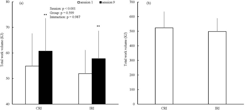 Figure 2. Results of total work volume in session one and session nine (a) and throughout the training period (b). CRI, constant rest interval; IRI, incremental rest interval; **p < 0.001 vs. session one; data are expressed as mean ± SD.