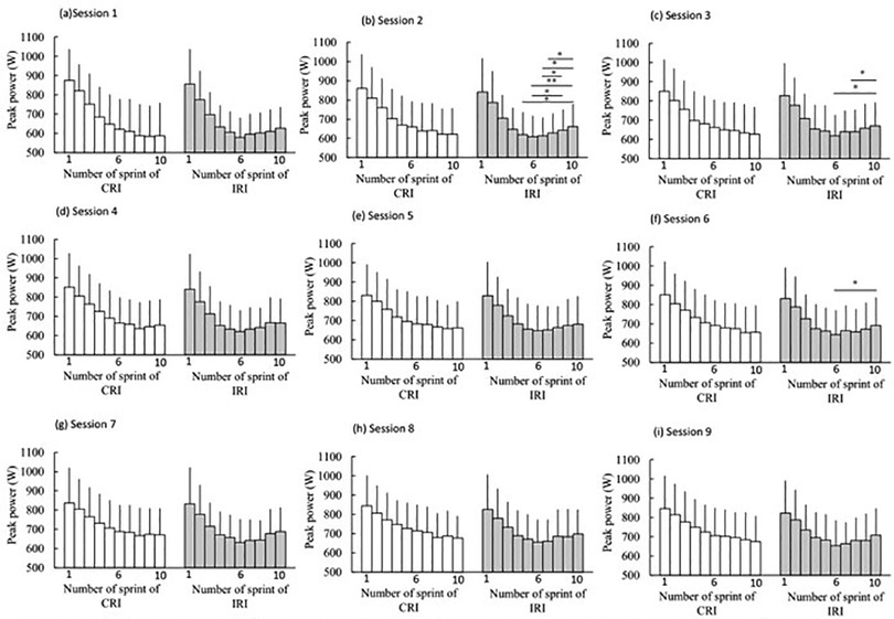 Figure 3. Results of peak power in each set during repeated sprint cycling training across all the sessions. Session 1 (a), Session 2 (b), Session 3 (c), Session 4 (d), Session 5 (e), Session 6 (f), Session 7 (g), Session 8 (h), Session 9 (i). CRI, constant rest interval; IRI, incremental rest interval; data are expressed as mean ± SD.*P < 0.05, **P < 0.01.
