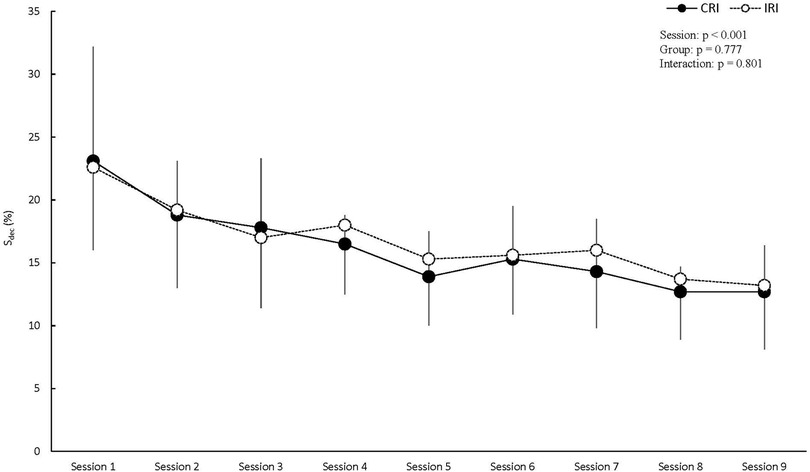 Figure 4. Decrement score results across all sessions. CRI, constant rest interval; IRI, incremental rest interval; Sdec, decrement score; data are expressed as mean ± SD.