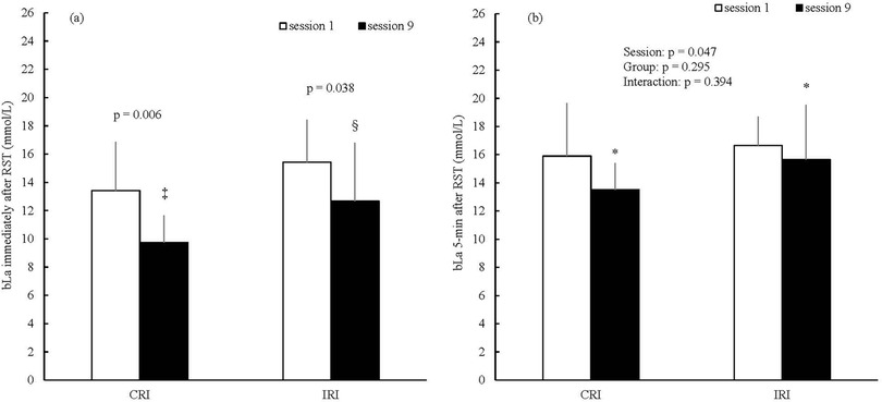 Figure 5. The bLa results immediately (a) and 5-min (b) after the RST. ‡p < 0.01 vs. session one in the CRI group; §p < 0.05 vs. session one in the IRI group; *p < 0.05 significant main effect of the session. Data are expressed as mean ± SD. bLa, blood lactate; RST, repeated sprint training; CRI, constant rest interval; IRI, incremental rest interval.