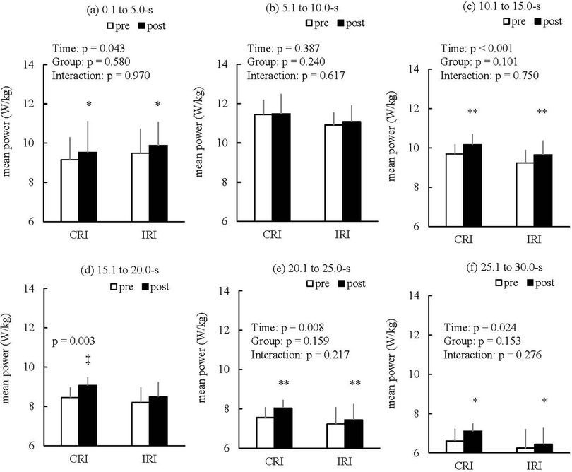 Figure 6. Results of the mean power at 0.1–5.0-s (a), 5.1–10.0-s (b), 10.1–15.0-s (c), 15.1–20.0-s (d), 20.1–25.0-s (e), and 25.1–30.0-s (f) during the WAnT. ‡p < 0.01 vs. pre-training in the CRI group; **p < 0.01 significant main effect of time; *p < 0.05 significant main effect of time. Data are expressed as mean ± SD. CRI, constant rest interval; IRI, incremental rest interval; WAnT, Wingate anaerobic test.