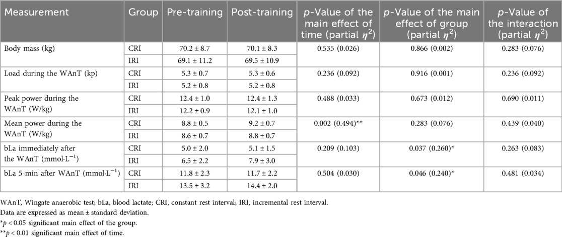 In this study, we examined the effects of RST with CRIs or IRIs on Sdec, bLa, and WAnT performance. Sdec, as an index of muscle fatigue, showed no statistically significant differences between the groups in all sessions, indicating that muscle fatigue was similarly induced by both CRIs and IRIs during the RST. Similarly, bLa did not differ significantly between the groups in sessions one and nine. However, despite the increase in total work volume during RST from session one to session nine in both groups, the bLa was significantly decreased in both groups in session nine compared with session one. Therefore, it is possible that metabolic adaptations associated with lactate occurred in both groups. After performing sessions one to nine within 3 weeks, the participants’ peak power during the WAnT did not increase in either group. In contrast, the mean power during the WAnT increased significantly in both groups from pre- to post-training, but there were no significant differences between the groups. These improvements in mean power may reflect an increased power sustainability rather than peak explosiveness. Additionally, the mean power every 5 s during the WAnT increased significantly in both groups in the early (0.1–5.0 s), middle (10.1–15.0 s), and final phases (20.1–25.0 s and 25.1–30.0 s), but no significant differences were observed between the groups. The mean power at 15.1–20 s during the WAnT only significantly increased in the CRI group. Finally, the bLa after the WAnT did not significantly change in either group from pre- to post-training. Based on the power results during the WAnT and the post-WAnT bLa results, it is possible that anaerobic glycolysis did not change significantly in either group, whereas aerobic capacity may have improved in the CRI group. These results suggest that RST with IRIs may not provide additional benefits over RST with CRIs in untrained young adults.