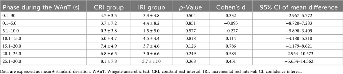 Figures 6a–f show the mean power every 5 s during the WAnT. In the results of the two-way (time × group) ANOVA for the mean power at 0.1–5.0 s during the WAnT, although a significant main effect of time was observed, no significant main effect of group or the interaction (Figure 6a; main effect of time: partial η2 = 0.245; main effect of group: partial η2 = 0.021; interaction: partial η2 = 0.000) was noted. For the mean power at 5.1–10.0 s during the WAnT, no significant main effect of time, group, or the interaction (Figure 6b; main effect of time: partial η2 = 0.050; main effect of group: partial η2 = 0.091; interaction: partial η2 = 0.017) was observed. For the mean power at 10.1–15.0 s during the WAnT, although a significant main effect of time was observed, no significant main effect of group or the interaction (Figure 6c; main effect of time: partial η2 = 0.554; main effect of group: partial η2 = 0.169; interaction: partial η2 = 0.007) was noted. The mean power at 15.1–20.0 s during the WAnT increased from pre- to post-training in the CRI group (Figure 6d; paired t-test: Cohen's d = 1.269; 95% CI of the mean difference = 0.290–0.929). However, the mean power at 15.1–20.0 s during the WAnT did not increase from pre- to post-training in the IRI group (Figure 6d; Wilcoxon signed-rank test: p = 0.051; r = 0.652). Additionally, no significant difference was observed between the CRI and IRI groups in the mean power at 15.1–20.0 s during the WAnT post-training (Figure 6d, Mann–Whitney U-test: p = 0.093, r = 0.420). In the results the two-way (time × group) ANOVA for the mean power at 20.1–25.0 s during the WAnT, although a significant main effect of time was noted, no significant main effect of group or the interaction (Figure 6e; main effect of time: partial η2 = 0.382; main effect of group: partial η2 = 0.128; interaction: partial η2 = 0.100) was observed. For the mean power at 25.1–30.0 s during the WAnT, a significant main effect of time was observed, but no significant main effect of group or the interaction (Figure 6f; main effect of time: partial η2 = 0.294; main effect of group: partial η2 = 0.131; interaction: partial η2 = 0.079) was observed.