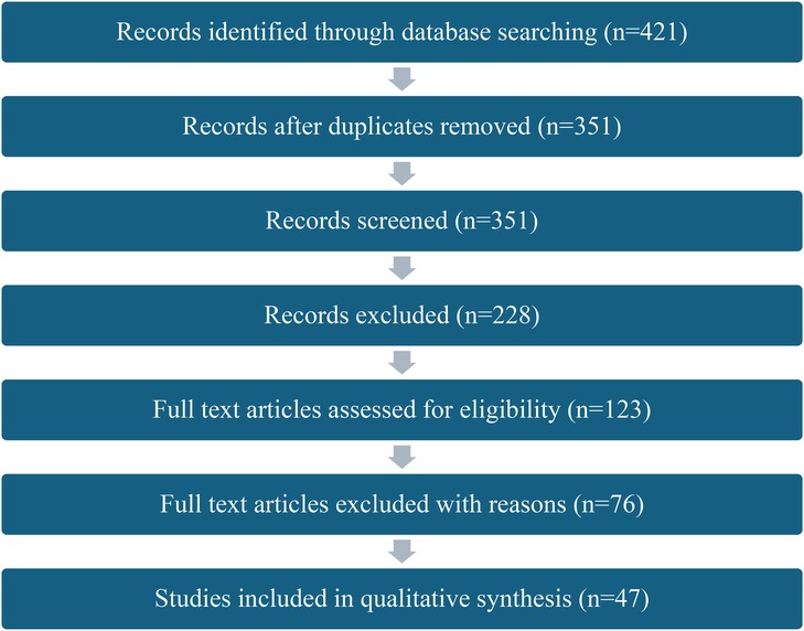 The screening process was conducted in three stages: title and abstract screening, full-text review, and final inclusion. The two reviewers independently screened all records at each stage. Discrepancies were resolved through discussion. Initial searches yielded 421 records. After removal of duplicates 351 records remained. Following title and abstract screening, 228 were excluded. The full text of the remaining 123 articles was assessed for eligibility, resulting in a final selection of 47 studies. This process is illustrated in the PRISMA flow diagram (Figure 1). For each article prior to detailed analysis, a full citation (Harvard style), abstract, and summary of conclusions were recorded. Articles were thematically coded based on relevance to the five focus areas. These themes informed the conceptual synthesis presented in the next sections of the paper starting with a closer look at the emergence of positioning athletes as brands. It needs to be noted that a range of articles that were referenced in regard to the conceptual framework for this paper, were not generated as part of systematic review. This is why the number of references in this paper exceeds the number of studies included in the qualitative synthesis.
