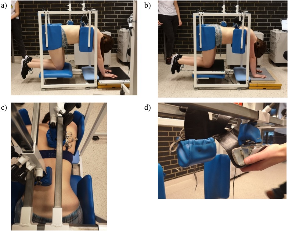 Figure 1. Exercises of the participant in the initial prototype of the DISC4SPINE system: (a) Kneeling-supported position with the measurement platform under the hands, with therapeutic heads interacting with the spine and ground reaction forces of the upper limbs recorded. (b) Kneeling-supported position with the measurement platform under the knees, with ground reaction forces of the lower limbs recorded. (c) Top view showing the arrangement of the therapeutic heads on the spine. (d) Close-up illustrating the placement of Medilogic measuring inserts on the heads.