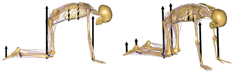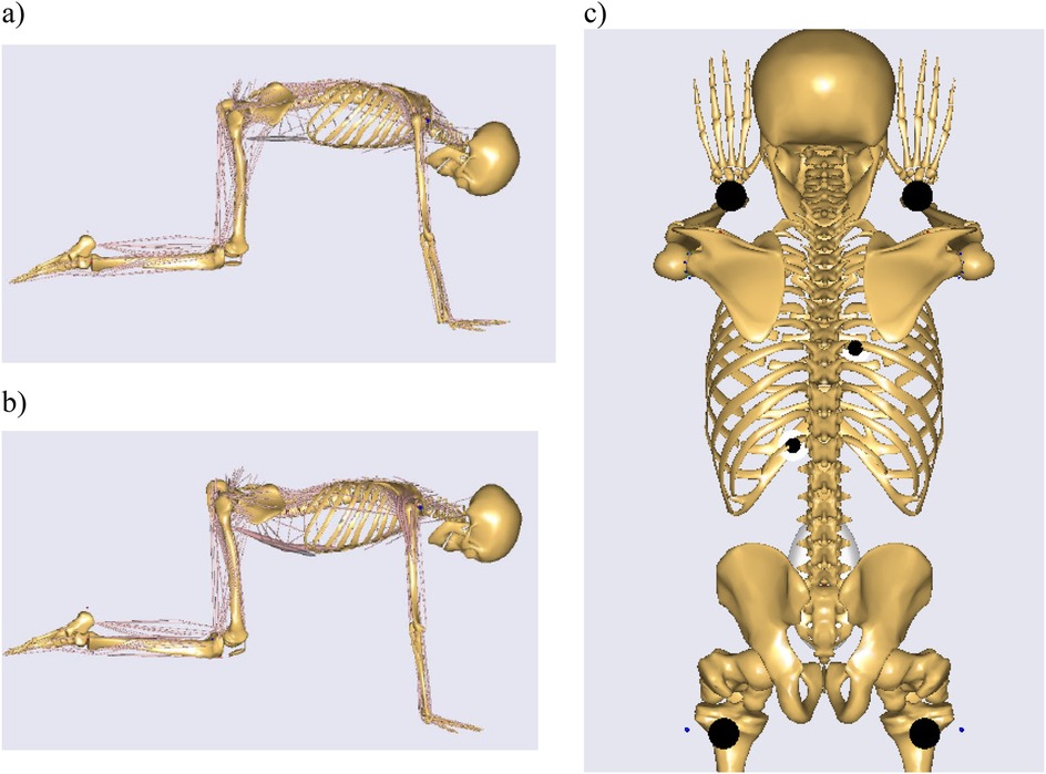 The values of the ground reaction forces of the lower and upper limbs, as well as the values of the head reactions in the model, were entered into the model in the form of force vectors. The values of these vectors were collected during the experimental tests (as the sum of the pressure from all the sensors under each body segment). The force vectors for the lower extremities were applied proximally to the upper tibial epiphysis, while those for the upper extremities were applied distally to the radius bone and the carpal bones. The force vectors of the resistance heads were positioned in close proximity to the transverse processes of the vertebrae. The selection of application sites for the vectors was made on the basis of ongoing studies and color pressure maps, with the most stressed areas being identified for intervention (Figure 2c). The prepared model of the musculoskeletal system, with force vectors positioned during the exercise (Figure 3), is presented herein.