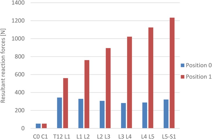 The company's own research demonstrated a definitive variation in the values of forces at the intervertebral joints between the “0” and “1” positions. The lowest recorded values of reaction forces were observed at a level of 52 N for C0 - C1, with no discernible differences observed between the positions that were studied. The highest values were recorded at the Th 12 -L1 level: 343 N for the “0” position and 560 N for the “1” position. The highest recorded values of reaction forces in the intervertebral joints were observed in the “1” position for the L5-S1 level. Subsequent to normalizing the data to the subject's body weight, the force values for the “0” position were found to be lower than in the Bassani and El-Rich study. However, these values increased in the “1” position. The values of the measured forces exhibited a linear increase in the L5 direction, a finding that aligns with the conclusions of the El-Rich study (30).