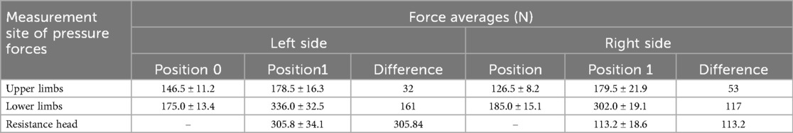 The values of the average forces in the positions under study demonstrate a clear differentiation between the upper and lower extremities. The measurements revealed that the Position 1 exhibited higher values in comparison to the initial “0” position. In contrast, such clear differences were not observed between the sides of the test. As demonstrated in Table 1, higher average values of forces acting on the lower limbs were observed.