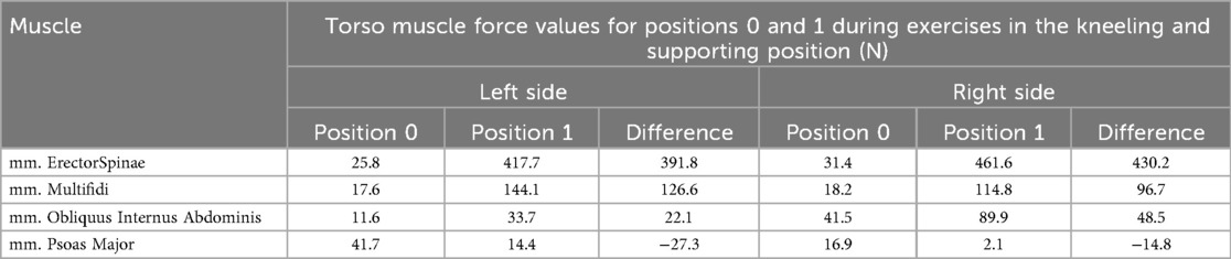 Table 2. The force values of selected trunk muscles for positions “0” and “1” during kneeling-supported exercises.