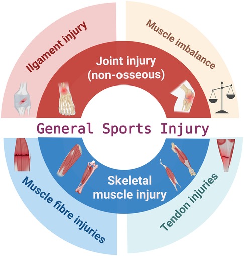 To avoid conceptual overlap with the “contact/non-contact” mechanism-based classification, this study adopts a structural framework of “General Sports Injuries—Degenerative Injuries—Accidental Injuries,” in order to better serve practical decision-making in injury prevention and rehabilitation. Among these, “General Sports Injuries” primarily refer to those that can be reduced in incidence or severity through planned physical and technical training, and are predominantly non-contact in mechanism (e.g., muscle, tendon, and ligament injuries) (7). “Degenerative Injuries” are also mostly derived from non-contact mechanisms (such as tendinopathy, degenerative meniscus injury, etc.) (8). It is worth noting that in elite athletes, acute traumatic meniscus tears are also frequently observed. Although such injuries are usually categorized as contact injuries, they deserve particular attention because they involve not only preventive measures but also post-treatment rehabilitation (9). Regarding contact injuries, due to their high degree of randomness and difficulty in preventing them through training, this paper categorizes them under “Accidental Injuries”.