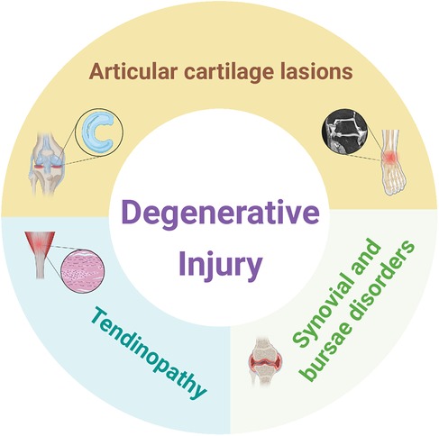 It should be noted that the same anatomical structure may sustain either degenerative or traumatic injuries. For example, meniscal injuries in elite athletes can be either degenerative, resulting from cumulative loading, or traumatic, caused by acute contact (9). The ESSKA consensus emphasizes the importance of distinguishing these two mechanisms due to their different etiologies and treatment strategies (93). While degenerative lesions are generally managed conservatively, acute traumatic tears—though classified as contact injuries—often require surgical intervention and structured rehabilitation, and are therefore frequently considered alongside degenerative injuries in clinical practice (94).