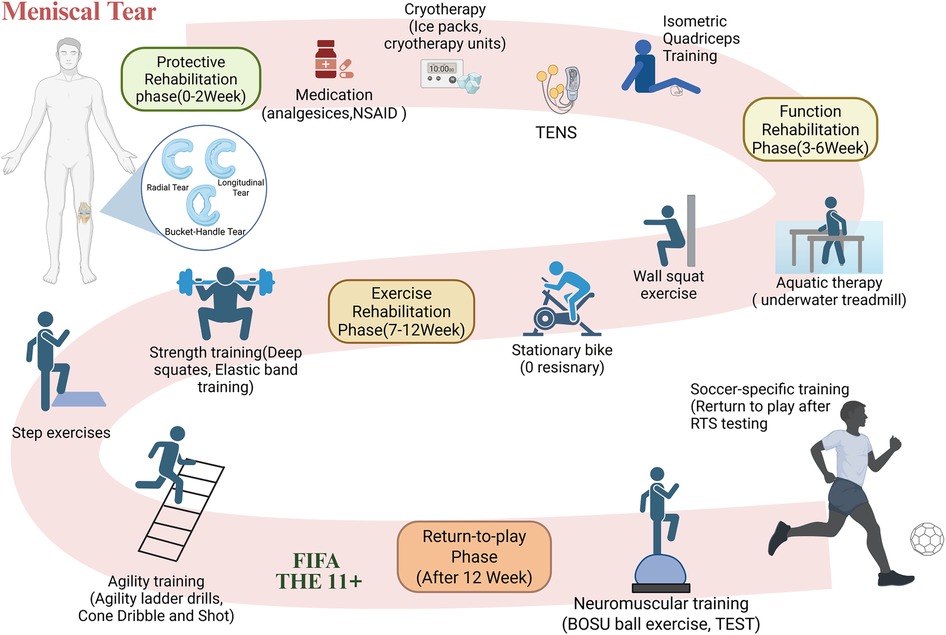 According to current recommendations, post-operative rehabilitation after meniscal surgery is divided into three key phases. During the protective rehabilitation phase (0–2 weeks), the focus is on quadriceps activation, crutch weaning, and achieving a range of motion between 0° and 30°. In the functional rehabilitation phase (3–6 weeks), the objective is to enhance lower extremity strength, improve balance and proprioception, and range of motion up to 90°. The exercise rehabilitation phase (7–12 weeks), emphasizes the gradual increase in training burden to regain athletic ability. Additionally, football-specific training should be integrated to standardize movements that are specific to the sport (97, 99–102). Figure 3 depicts a comprehensive rehabilitation training regimen for meniscus tears post-surgery, with distinct rehabilitation techniques chosen based on the specific objectives of each phase.