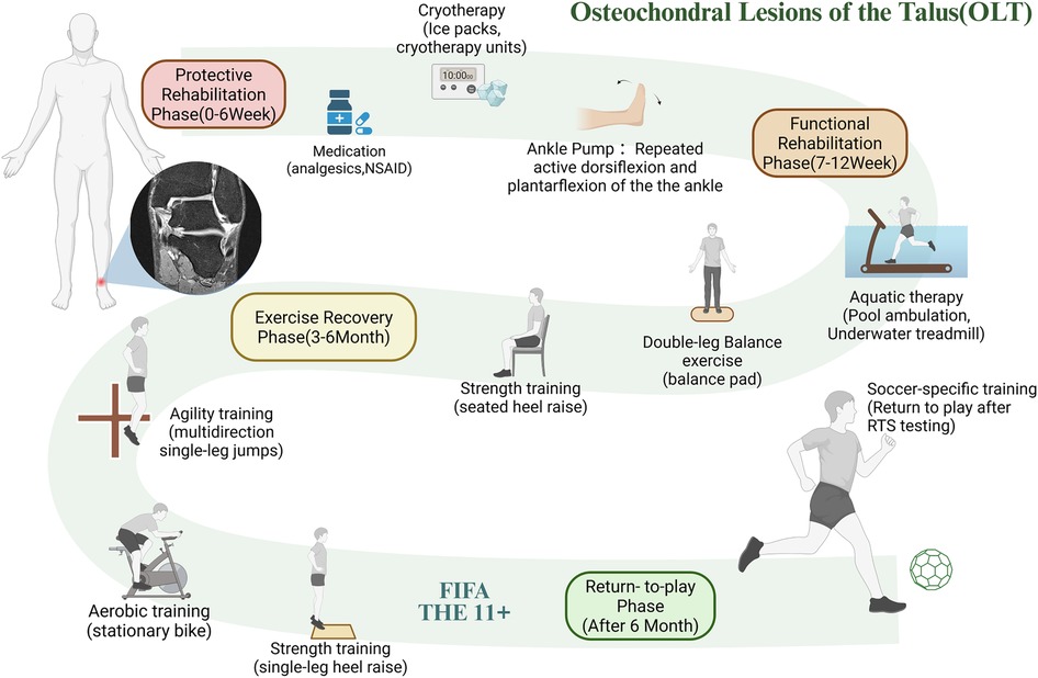 Figure 4. Flowchart of the phased rehabilitation protocol after OLT surgery. This figure presents the staged rehabilitation for talar OLT, including protective, functional, exercise recovery, and return-to-play phases, involving ankle pump, balance, aquatic training, and sport-specific assessment. RTS testing return-to-sport testing. The magnetic resonance tomography of the ankle joint icon in the panel is adapted from Biehl et al. (149). Created using BioRender (ID: NS28D5W7JL).