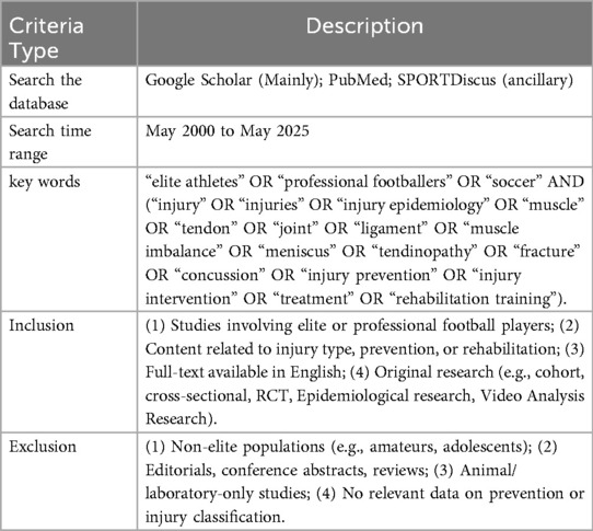 To ensure both breadth and sensitivity, the search strategy combined Boolean operators (AND, OR) and truncation symbols (*) for keyword combinations. Both Medical Subject Headings (MeSH) and free-text terms were used. Keywords included but were not limited to: “elite athletes” OR “professional footballers” OR “soccer” AND (“injury” OR “injuries” OR “injury epidemiology” OR “muscle” OR “tendon” OR “joint” OR “ligament” OR “muscle imbalance” OR “meniscus” OR “tendinopathy” OR “fracture” OR “concussion” OR “injury prevention” OR “injury intervention” OR “treatment” OR “rehabilitation training”). All keywords are used for searching in the title, abstract, and keyword fields.