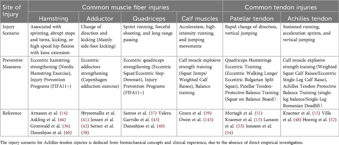 Strains, partial tears, and muscle ruptures are among the most prevalent muscle fiber injuries in football (8). Most of these injuries occur during high-intensity activities such as sprinting, jumping, or striking (32). When the mechanical strain applied to the muscle exceeds its physiological capacity, internal stress within the muscle can increase by several orders of magnitude, leading to varying degrees of muscle fiber disruption, which is frequently accompanied by inflammation or damage to the surrounding connective tissues (33). Excessive eccentric loading is recognized as the most common cause of acute muscle fiber injuries (34). Table 2 delineates muscle fiber injuries frequently observed in elite soccer players throughout athletic endeavors, alongside the elevated prevalence of these injuries in particular sporting contexts and preventive strategies corroborated by extant literature. The hamstrings, adductors, quadriceps, and calf muscle groups are the most often injured muscle fibers (35), often linked to high-velocity running, abrupt directional changes, jumping, and explosive actions (36–39). Preventive therapies largely encompass eccentric training and injury prevention programs(e.g., FIFA1+) (40–43).
