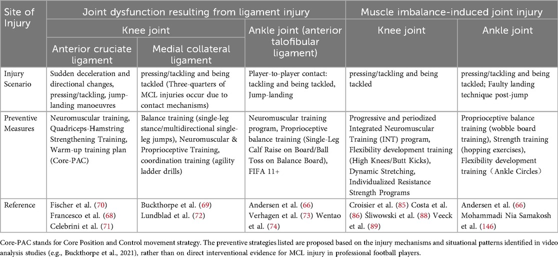 Most ligament injuries in football occur when muscles fail to adequately absorb ground reaction forces. Sustained high-impact forces over a short period may increase joint loading and result in ligament rupture (61). Rarer ligament injuries generally result from substantial external impacts during intense match situations. Table 3 delineates ligament injuries frequently observed in elite football players within the context of general sports injuries, including high-risk sports scenarios and preventive exercise training approaches substantiated by available literature. Ligament injuries (ACL and MCL), commonly arise from abrupt halts, swift directional shifts, or landing maneuvers, especially during offensive and defensive engagements and sliding tackles (66, 68, 69). Associated preventive strategies encompass muscle balance training and neuromuscular training, designed to augment ligament load-bearing capacity and enhance joint stability (70–74).