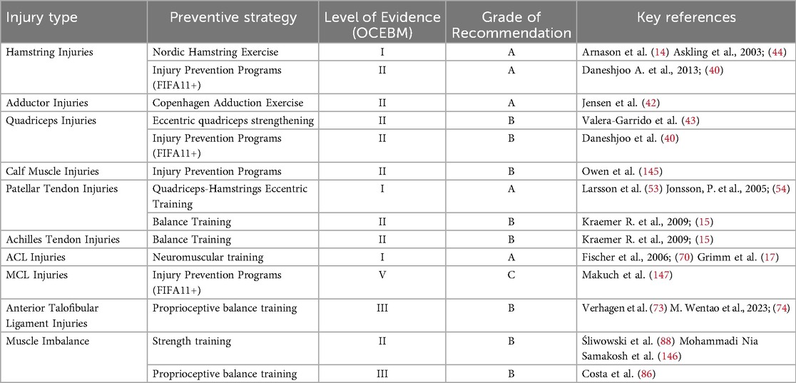 Table 4. Levels of evidence and grades of recommendation for prevention strategies of general sports injuries in elite football.